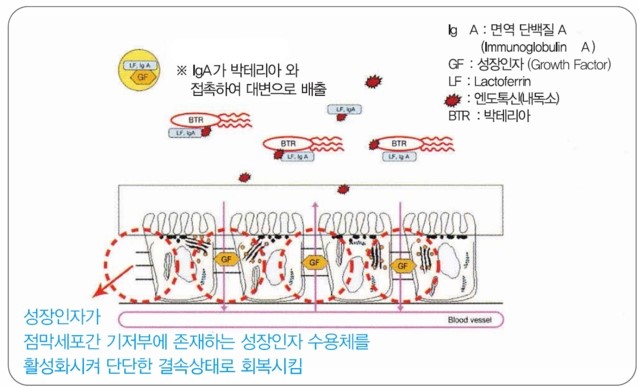 L-글루타민은 장 점막의 에너지원으로 알려져 있습니다. 락토페린은 장내 독소를 제거하는 데 도움이 된다고 합니다. 면역 글로불린은 박테리아, 바이러스 및 독소를 차단하여 항상성 유지를 돕는다고 합니다. 성장 인자는 뼈, 근육 및 연골을 만들고 유지하는 데 도움이 된다고 합니다. 참고로 소 초유는 사람 초유보다 면역글로불린 LGG 함량이 높다.