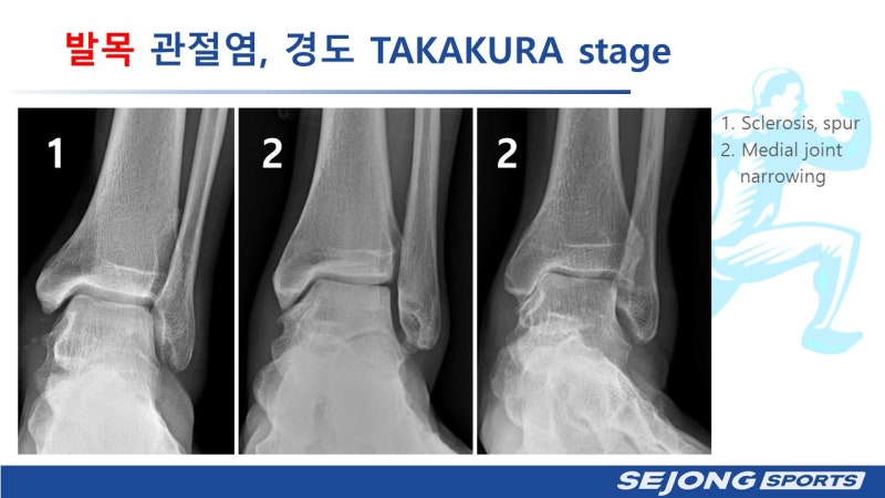 추가 치료에는 적절한 휴식, 진통제 및 관절 내 주사가 포함됩니다. 비수술적 치료가 효과가 없는 경우, 약을 먹어도 발목이 여전히 붓고 통증이 있는 경우, 하루 20분 걷기가 힘든 경우, 주 5일 이상 통증이 있는 경우 수술이 필요하다. 보통 이렇게 설명합니다. 흔히 발목관절염 수술이라 불리며 발목을 고정시키거나 인공관절 치환술을 시행합니다. 다음 블로그에서는 발목 고정술과 인공관절 치환술 중 어떤 것을 선택해야 하는지에 대해 알아보겠습니다. 이러한 인공관절이나 발목을 고정하면 자신의 관절이 망가져 전혀 움직일 수 없게 되거나, 수명이 긴 인공관절로 대체하게 되면 재수술만 걱정할 수밖에 없다. 무릎도 마찬가지인데, 관절을 보존하면서 HTO(high tibial osteotomy)가 오래전부터 관절염의 초기와 중기에서 널리 사용되어 왔다. 무릎에 팔다리가 있을 때 내측에 많은 하중이 가해지는 절골술을 통해 무릎의 무게를 내측에서 외측으로 이동시켜 경골의 변형을 교정하는 수술입니다. 발목에서 이 접근법은 지난 10년 동안 상당히 발전했습니다. 발목 관절염에 가장 일반적으로 사용되는 분류 체계는 Takakakura 분류 체계입니다. 유형 1은 골조직이 관절에서 발달하고 뼈를 단단하게 만드는 정도입니다. 유형 2는 천장 관절의 내부 관절 표면이 좁아지거나 내부 관절 표면이 약간 함몰됩니다. 3형은 천골관절면이 접촉하여 진행하는 관절염이고, 4형은 모든 관절면이 접촉한 상태에서 내측 뿐만 아니라 외측으로도 진행되는 관절염입니다. 1형은 주로 약물과 주사로 치료하고, 3형과 4형은 비수술적 치료에 실패할 경우 인공관절이나 유합술로 치료한다. (어떤 경우에는 절골술도 시도합니다.) 발목을 보존하면서 결과를 볼 수 있는 가장 좋은 적응증은 2형입니다. 교정 절골술은 관절염이 내측에 국한되고 통증이 내측에 국한된 경우에 매우 효과적입니다. SMO(Superior Malleolar Osteotomy) SMO(Superior Malleolar Osteotomy)는 SMO(Superior Malleolus osteotomy)라고 하는 일종의 수술입니다. 표시된 바와 같이 목표는 관절면이 기울어지거나 다리가 있을 때 관절면을 지면과 평행하게 유지하여 체중 부하를 정상화하는 것입니다. 경골 내측에만 절골술을 하면 무게중심이 이동하게 되고 거골과 비골이 바깥쪽에서 한번 부딪히게 되어 바깥쪽에 통증이 발생하게 됩니다. 따라서 최근에는 경골과 비골을 동시에 교정하는 것을 선호하며 그 효과가 매우 좋은 것으로 보고되고 있다. 일반적으로 절골술 후 금속판을 사용하는데, 판이 부러지는 것을 방지하기 위해 두꺼운 금속판을 사용하는 것이 불편하다. 따라서 금속판을 제거하면서 연골이 회복되었는지 관절경을 통해 살펴보게 됩니다(^^;) 연골이 없는 부분이 완전히 채워지지는 않지만 섬유연골로 대체되는 것을 볼 수 있습니다. 트램웨이 병변(기차 트랙 수정) 영역에서도 약간의 섬유질을 볼 수 있습니다. 발목 점수는 평균 50점에서 83점으로 향상되었습니다. 통증이 완전히 완화되지 않더라도 일상생활에 지장을 주지 않으며, 자가 관절을 이용하여 장기적인 예후를 기대할 수 있으며, 발목과 팔다리의 내반 변형도 교정하기 때문에 향후 인공관절도 수월하다. 수술로. 발목관절염 초기에 관절 내전 소실, SMO 수술은 진행되기 전에 매우 효과적인 치료법입니다.