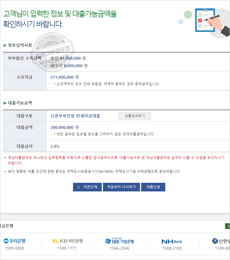 좀 더 자세한 각 은행별 상품 종류와 금리 및 월 상환액을 비교할 수 있는 사이트를 통해 충분히 비교하는 것이 좋습니다.아래 사이트를 참고하시기 바랍니다.☞은행별 금리비교사이트 바로가기, 각 은행별로 필요한 서류가 조금씩 다를 수 있으나 아래 서류가 필요합니다.확정일자를 받은 임대차계약서, 소득입증서류, 주민등록등본, 전입가구 열람내역, 계약금 입금확인증, 신분증, 신혼부부, 전세대출부부 합산, 연소득 3.25억원 이하, 순자산가액 6천만원 이하, 무주택세대주, 신혼부부(7년 이내 또는 3개월 이내 결혼예정자)