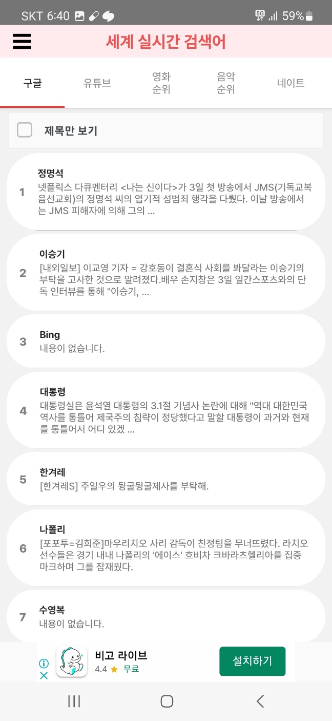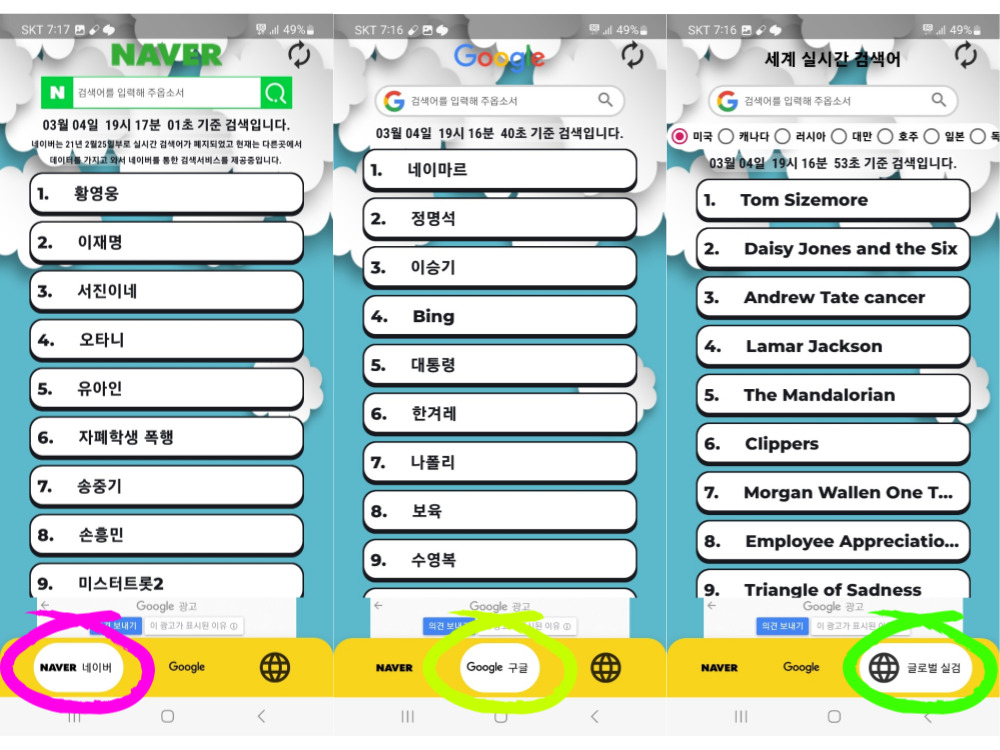 아래 3개의 탭으로 구성되어 있으며 네이버, 구글, 글로벌 검색어를 실시간으로 확인할 수 있습니다.