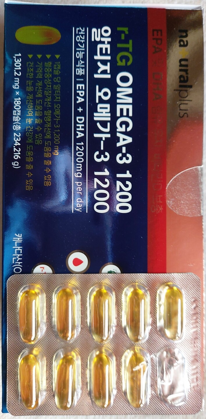 rTG Omega-3 1200 제품은 rTG EPA + DHA를 함유한 오일로 흡수율과 생체이용율이 좋습니다. EPA+DHA를 함유한 오일은 분자 구조에 따라 TG형, EE형, rTG형으로 나눌 수 있습니다. 그 중 rTG형은 EE형의 재에스테르화 형태이다. ◇EPA+DHA 함유 지방형▲TG형 – 생선에서 추출한 천연 형태 EPA+DHA 함유 오일의 분자 구조(에스테르화 포화지방산 제거)▲ EE형 – 불필요한 포화지방 제거(에스테르화 포화지방산 제거) ▲rTG형 – EE형을 다시 정제하여 높은 흡수율과 생체이용률, TG 분자 형태와 유사(TG형으로 에스테르화) Omega-3 1200 포인트 투! 총 EPA + DHA 1200mg을 위해 하루에 캡슐 1개를 섭취하세요. 캡슐당 총 EPA + DHA의 양이 중요합니다. RTG 오메가-3 1200은 1301.2mg 캡슐에 최대 1200mg의 EPA+DHA를 함유한 제품입니다. RTG Omega-3 1200의 기능에 대해 자세히 알아보십시오! ▲ 혈중 중성지방 개선에 도움을 줄 수 있다 – EPA와 DHA는 간에서 중성지방 합성을 방해해 혈중 중성지방 농도를 낮춘다. ▲ 혈액순환 개선에 도움을 줄 수 있음 – EPA와 DHA는 과도한 혈액응고를 조절하여 혈액순환을 원활하게 할 수 있음 ▲ 기억력 향상에 도움을 줄 수 있음 – 뇌를 구성하는 중요한 성분 중 하나인 DHA를 보충하면 기억력 향상에 도움이 됨. 알타쥬 오메가-3 1200포인트 세트! 중금속 및 오염에 대한 노출이 적은 작은 물고기 먹이사슬의 상위에 있을수록 바다에 있는 다른 물고기나 유해 물질을 먹으면서 중금속 오염에 노출될 가능성이 높아집니다. Natural Plus Altiji Omega 3 1200은 먹이 사슬의 바닥에 있는 작은 물고기로 만들어져 중금속에 대한 노출과 오염이 적습니다. 알타쥬 오메가-3 1200포인트 4! 비타민D 1,000IU 1일 권장량의 250% 함유 RTG 오메가3 1200 비타민D 1000IU 및 1일 권장량의 250% 함유. 하루 한 캡슐은 비타민 D 일일 권장량의 250%를 제공합니다. ▲ 칼슘과 인의 흡수와 이용에 필요 – 비타민D의 주요 기능은 혈중 칼슘과 인의 함량을 조절하고 균형을 유지하는 것이다. ▲ 뼈의 형성과 유지에 필요-신경과 근육의 기능 유지 뼈의 성장에 필요한 충분한 칼슘을 공급하지만 인산칼슘을 뼈의 주성분으로 만드는 역할도 한다. 이 제품은 골다공증 위험을 줄이는 데 도움이 될 수 있습니다. 알티지 오메가-3 1200 포인트 파이브! PTP 독립 포장, 편리하고 위생적인 ​​소비 EPA+DHA가 함유된 오일 특성상 산소와 열에 노출되면 쉽게 썩고 제품이 변질됩니다. RTG 오메가-3 1200은 PTP 타입으로 1일 1캡슐씩 개별 포장되어 있어 편리하고 위생적입니다. 알티지 오메가-3 1200은 캐나다에서 직수입한 제품으로 한국식품의약품안전청에서 기능승인을 받은 제품이고, 알티지 오메가-3 1200은 캐나다에서 직수입한 제품으로 한국식품의약품안전청에서 기능을 승인한 제품입니다. 의약청. 캐나다 청정지역에서 생산되기 때문에 더욱 믿을 수 있는 제품입니다. 알티지 오메가-3 1200은 캐나다에서 직수입한 제품으로, 식품의약품안전처로부터 그 기능을 인정받았기 때문에 안심하고 드셔도 됩니다. 풍부한 경험과 앞선 기술력으로 세계 각국에 건강기능식품을 제공합니다. 네추럴라이프의 모든 제품은 최신의 전문 자동화 설비에서 제조 및 포장되며 음질과 정확한 내용으로 신뢰를 쌓아 명성을 이어가고 있습니다. 이런 분들에게 RTG 오메가-3 1200을 추천합니다! ◇ RTG 오메가-3 1200은 이런 분들에게 추천합니다! ▲ EPA+DHA 함유 깨끗하고 안전한 오일을 섭취하고 싶은 분 ▲ 바쁜 생활과 불규칙한 식습관을 가진 현대인 ▲ 균형잡힌 영양이 필요한 성장기 어린이 및 청소년 ▲ 혈중 중성 혈중지질 및 혈액순환 개선이 필요한 분 ▲ 많이 섭취 간편식품피플 ▲ 기억력 향상에 도움이 필요한 사람 알지 오메가-3 1200 건강을 챙기세요! (제품명) 내츄럴플러스 RT 오메가3 1200 (섭취방법) 1일 1회 1캡슐을 물과 함께 섭취 (복용시 주의사항) 손이 닿지 않는 곳에 보관 (보관방법) 직사광선을 피하고 서늘한 곳에 보관 ◇영양 및 기능성 정보▲ EPA+DHA: 기억력 향상에 도움, 혈중 중성 혈중 지질 개선에 도움, 혈액순환 개선 ▲비타민 D: 칼슘과 인의 흡수 및 이용에 필요, 뼈 형성 및 유지에 필요, 골다공증 위험 감소에 도움이 됨 여기에 설명 . ◇ 혈액순환이란? – 혈액순환이란 혈액이 혈관을 통해 신체의 여러 부분으로 흐르는 것을 말합니다. 혈액은 신체의 여러 조직에 산소와 영양분을 공급하고, 세포에서 생성된 노폐물을 제거하고, 필수 호르몬을 운반하며, 외부 유해 물질로부터 세포를 보호하고, 적절한 체온을 유지하며, 지혈 역할을 합니다. 신체의 개선을 유지하십시오. 따라서 원활한 혈류는 신체 기능 유지에 매우 중요합니다. ※ 출처 : 식품의약품안전처 식품안전정보포털 건강기능식품 기능평가지침에 한함. 특히 혈중 콜레스테롤, 지방, 포도당과 밀접한 관련이 있어 적절한 식이요법으로 조절할 수 있다. 치킨, 햄버거, 고기, 피자 등 간편식 ※출처 : 식품의약품안전처 식품안전정보포털 홈페이지 기능성건강기능식품 평가지침 남들이 챙겨주는데 어쩔 수 없다! Natural Plus RT Omega 3 1200은 우리 가족의 건강을 위해 권장되는 기억력과 혈중 중성 지방을 개선하는 데 도움이 될 수 있습니다. ■ 내추럴플러