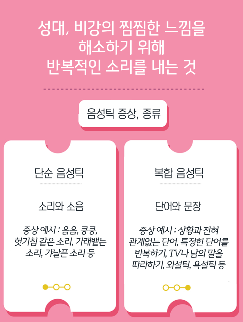 운동 틱: 눈 깜빡임, 머리 흔들림, 찡그린 얼굴, 목 뒤틀림, 어깨 흔들림, 팔 흔들기, 꿀꿀 거리는 소리, 떨림 등 물론 틱은 위의 유형 외에도 같은 말이나 말을 반복하거나 욕을 하는 등 여러 가지 형태로 나타날 수 있다. 위와 같은 증상이 아이의 의사와 다르게 나타날 경우 반드시 아이를 치료하는 의료기관에 가 뇌병원 등 정밀검사를 받아야 합니다. 적시에 조치를 취해야만 우리 아이들의 밝은 미래와 가족의 건강을 지킬 수 있습니다. 행복.